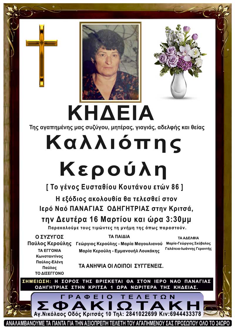 Με βαθιά συγκίνηση και πλήθος κόσμου να συγκεντρώνεται για να αποδώσει τα στερνά της αντίο, τελέστηκε η κηδεία της Καλλιόπης Κερούλη. Η τελετή, που διεξήχθη σε ένα κλίμα βαθιάς περισυλλογής και σεβασμού, ανέδειξε το μέγεθος της αγάπης και της εκτίμησης που περιέβαλλε την εκλιπούσα. Συγγενείς, στενοί φίλοι, αλλά και αναρίθμητοι συμπολίτες, έδωσαν το παρών, αποχαιρετώντας με δάκρυα στα μάτια μια ξεχωριστή παρουσία που σημάδεψε τις ζωές τους. Η απώλειά της, αναμφίβολα, αφήνει ένα δυσαναπλήρωτο κενό, στερώντας από την κοινωνία μας μια αξιόλογη ψυχή. Η παρουσία τόσου κόσμου στην τελευταία της κατοικία, μαρτυρεί τη σημασία που είχε η Καλλιόπη Κερούλη για πολλούς. Ανέκαθεν άνθρωπος με ευαισθησία και αφοσίωση, κατάφερε να κερδίσει την αγάπη και τον σεβασμό όσων την γνώρισαν. Οι ευχές για την ανάπαυση της ψυχής της διαδέχονταν η μία την άλλη, ενώ οι αναμνήσεις από τις στιγμές που μοιράστηκαν μαζί της, πλημμύριζαν τις καρδιές των παρευρισκομένων.