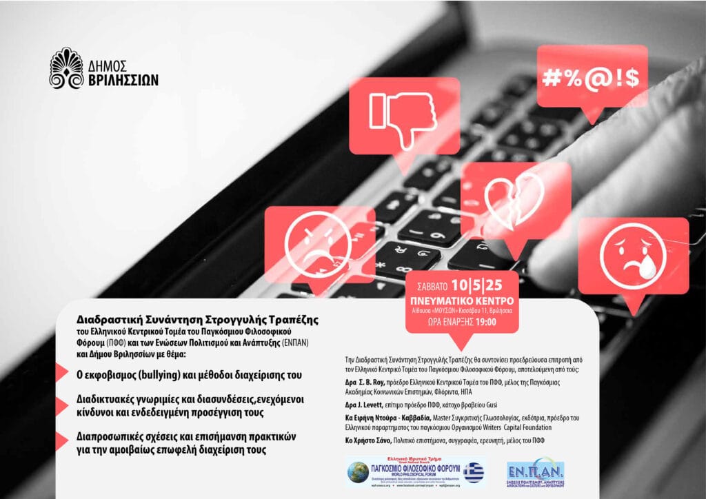 O Δήμος Βριλησσίων φιλοξενεί τη Διαδραστική Συνάντηση Στρογγυλής Τραπέζης του Ελληνικού Κεντρικού Τομέα του Παγκόσμιου Φιλοσοφικού Φόρουμ (ΠΦΦ) και των Ενώσεων Πολιτισμού και Ανάπτυξης (ΕΝΠΑΝ) με θέμα τον εκφοβισμό και το διαδίκτυο το Σάββατο 10/05/2025 στις 19:00 στο Πνευματικό Κέντρο, Κισσάβου 11.