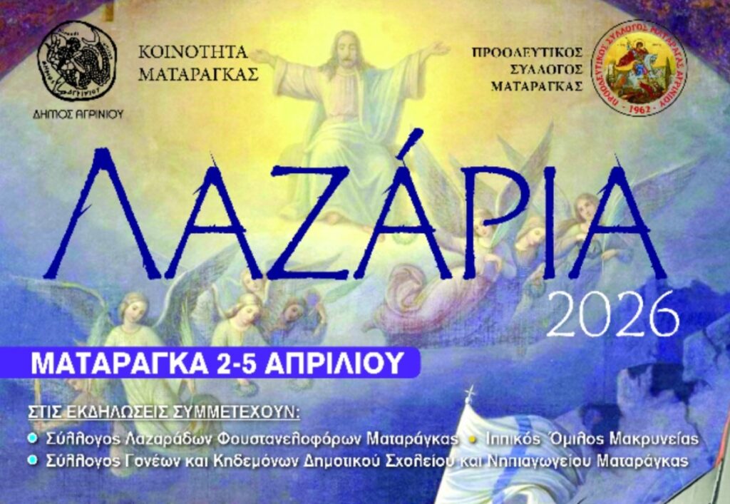 Ο Δήμος Αγρινίου, σε άριστη συνεργασία με την Κοινότητα της Ματαράγκας, ετοιμάζεται να υποδεχθεί το 2026 με τις ξεχωριστές και ιστορικές επετειακές εκδηλώσεις «Λαζάρια 2026». Η Ματαράγκα, ένας τόπος με βαθιές ρίζες και πλούσια παράδοση, θα αποτελέσει το επίκεντρο αυτού του σημαντικού πολιτιστικού διημέρου, προσελκύοντας κατοίκους και επισκέπτες από όλη την ευρύτερη περιοχή. Το πρόγραμμα έχει σχεδιαστεί με μεράκι, φροντίζοντας να αναδειχθούν οι τοπικές ιδιαιτερότητες και ο πλούτος της πολιτιστικής κληρονομιάς. Η συμμετοχή ποικίλων φορέων, όπως πολιτιστικοί σύλλογοι, παραδοσιακές ομάδες, χορευτικά συγκροτήματα και τμήματα που θα πλαισιώσουν την παρέλαση, εγγυάται ένα εντυπωσιακό και ζωντανό θέαμα, αντάξιο της σημασίας των «Λαζαρίων». Οι εορταστικές εκδηλώσεις θα ξεκινήσουν με εορταστικό πνεύμα την Πέμπτη, 2 Απριλίου 2026. Ήδη από τις 16:00 το απόγευμα, οι αθλητικές δραστηριότητες θα δώσουν τον τόνο, με τη διεξαγωγή ενός αγώνα δρόμου που προορίζεται για τους μαθητές και τις μαθήτριες των Δημοτικών και Γυμνασιακών σχολείων της Ματαράγκας.