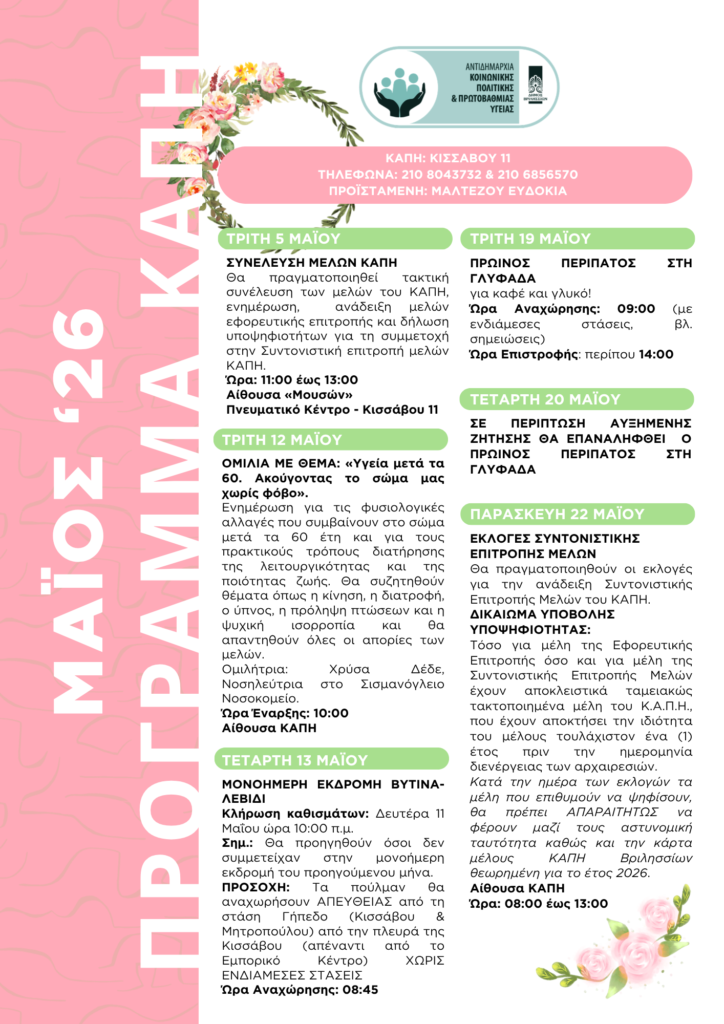 Με τον ερχομό του Μαΐου, τα Κέντρα Ανοιχτής Προστασίας Ηλικιωμένων (ΚΑΠΗ) προετοιμάζονται να υποδεχθούν τα μέλη τους με ένα ανανεωμένο και πλούσιο πρόγραμμα δραστηριοτήτων, σχεδιασμένο να καλύψει ένα ευρύ φάσμα ενδιαφερόντων και αναγκών. Στόχος του δήμου, μέσω των ΚΑΠΗ, είναι η παροχή ποιοτικών υπηρεσιών που ενισχύουν την ποιότητα ζωής των ηλικιωμένων συμπολιτών μας, προωθώντας την κοινωνική τους ένταξη, την ψυχική τους ευεξία και τη διατήρηση της σωματικής τους ακεραιότητας. Το πρόγραμμα του μήνα περιλαμβάνει ποικίλες προτάσεις, από σωματικές δραστηριότητες που εστιάζουν στη βελτίωση της φυσικής κατάστασης και της κινητικότητας, έως πολιτιστικές και καλλιτεχνικές εκδηλώσεις που προσφέρουν ψυχαγωγία και πνευματική διέγερση. Ιδιαίτερη έμφαση δίνεται στις ευκαιρίες για κοινωνική δικτύωση και συναναστροφή, με σκοπό την καταπολέμηση της μοναξιάς και την ενίσχυση των δεσμών μεταξύ των μελών.