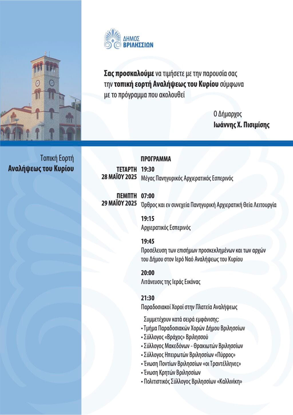 #Βριλήσσια Πρόγραμμα τοπικής εορτής Αναλήψεως του Κυρίου 28 και 29 Μαΐου Vrilissia24 26 Μαΐου 2025 Πρόγραμμα τοπικής εορτής Αναλήψεως του Κυρίου 28 και 29 Μαΐου To πρόγραμμα της τοπικής εορτής Αναλήψεως του Κύριου Μοιραστείτε το άρθρο: Continue Reading Previous: Κλειστές οι υπηρεσίες του Δήμου την Πέμπτη 29 Μαΐου λόγω της τοπικής εορτής της Αναλήψεως του ΚυρίουNext: Ομόφωνο ψήφισμα του Δημοτικού Συμβουλίου Βριλησσίων για το Παλαιστινιακό Διαβάστε επίσης Βριλήσσια: Ταμείο Δήμου κλειστό νωρίτερα την Πέμπτη 23/4 #Βριλήσσια Βριλήσσια: Ταμείο Δήμου κλειστό νωρίτερα την Πέμπτη 23/4 21 Απριλίου 2026 Βριλήσσια: Αναβαθμισμένο προαύλιο στο 3ο Δημοτικό Σχολείο #Βριλήσσια Βριλήσσια: Αναβαθμισμένο προαύλιο στο 3ο Δημοτικό Σχολείο 21 Απριλίου 2026 Βριλήσσια: Πολιτιστικοί Σύλλογοι Ενώνουν Δυνάμεις για την "3η Γιορτή Αγάπης" #Βριλήσσια Βριλήσσια: Πολιτιστικοί Σύλλογοι Ενώνουν Δυνάμεις για την "3η Γιορτή Αγάπης" 20 Απριλίου 2026