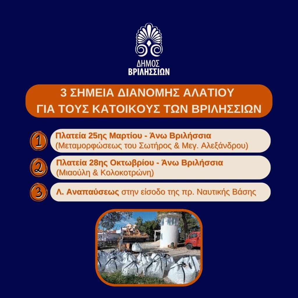 Σε τρία σημεία του Δήμου Βριλησσίων καθ΄ όλη τη διάρκεια της κακοκαιρίας θα διανέμεται αλάτι, το οποίο μπορούν να χρησιμοποιούν οι συμπολίτες μας για τις ανάγκες των εξωτερικών χώρων των οικιών τους. Τα σημεία είναι τα εξής: Πλατεία 25ης Μαρτίου Άνω Βριλήσσια, Πλατεία 28ης Οκτωβρίου Άνω Βριλήσσια, Λ. Αναπαύσεως στην είσοδο της πρ. Ναυτικής Βάσης.