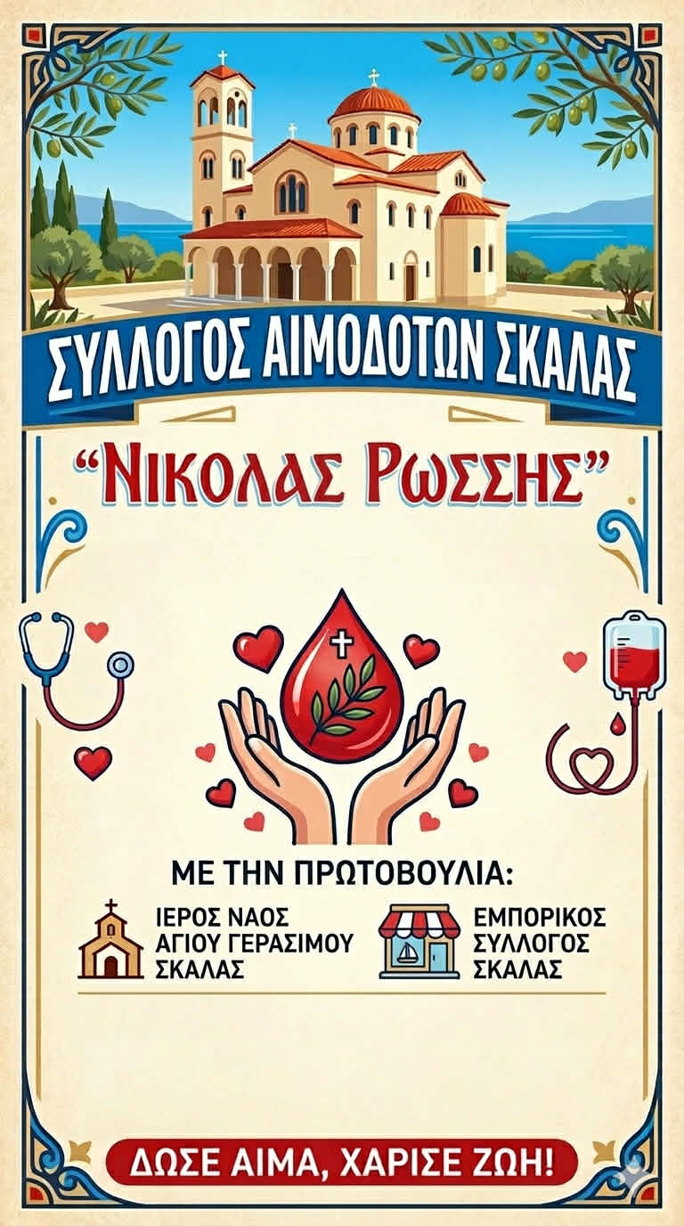 Μια αξιέπαινη πρωτοβουλία κοσμεί πλέον την κοινότητα της Σκάλας, με την ουσιαστική δράση του τοπικού εμπορικού συλλόγου και του εφημέριου, π. …. Με κοινή τους πρωτοβουλία, χαιρετίζουμε σήμερα την έναρξη μιας νέας, σημαντικής δράσης: τη δημιουργία μιας οργάνωσης αφιερωμένης στην εθελοντική αιμοδοσία. Ο σκοπός πίσω από αυτό το εγχείρημα είναι ξεκάθαρος και επιτακτικός: η ενίσχυση του εθνικού συστήματος υγείας και, κυρίως, η διασφάλιση της άμεσης και αποτελεσματικής βοήθειας σε ασθενείς που βρίσκονται σε κατάσταση ανάγκης. Η συγκρότηση μιας τέτοιας ομάδας φιλοδοξεί να δημιουργήσει ένα σταθερό δίκτυο ανθρώπων που είναι πρόθυμοι να προσφέρουν το πολύτιμο αυτό αγαθό, αντιμετωπίζοντας με προθυμία και αίσθημα ευθύνης τα έκτακτα περιστατικά που μπορεί να προκύψουν, εξασφαλίζοντας έτσι πολύτιμο χρόνο για την ανάρρωση όσων το χρειάζονται. Η πρωτοβουλία αυτή δεν σηματοδοτεί απλώς μια νέα οργάνωση, αλλά κυρίως την έμπρακτη απόδειξη της αλληλεγγύης και του ανθρωπισμού που χαρακτηρίζει τους κατοίκους της Σκάλας.