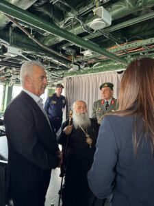 Ο Αρχιεπίσκοπος Γεώργιος τέλεσε αγιασμό και στη συνέχεια, μαζί με τον Υπουργό Δικαιοσύνης και την Υφυπουργό Ναυτιλίας, έτυχαν ενημέρωσης για τον εξοπλισμό και τα προηγμένα συστήματα του πολεμικού πλοίου, από τον Κυβερνήτη, Αντιπλοίαρχο του Πολεμικού Ναυτικού Ιωάννη Κιζάνη.