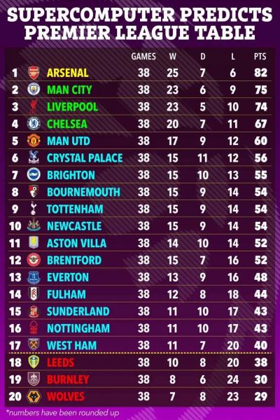 Σύμφωνα με την πρόβλεψη, η ομάδα του Μικέλ Αρτέτα θα σημειώσει 25 νίκες, 7 ισοπαλίες και 6 ήττες, συγκεντρώνοντας 82 βαθμούς. Η Μάντσεστερ Σίτι θα τερματίσει δεύτερη με 75 βαθμούς και η Λίβερπουλ τρίτη με 74.